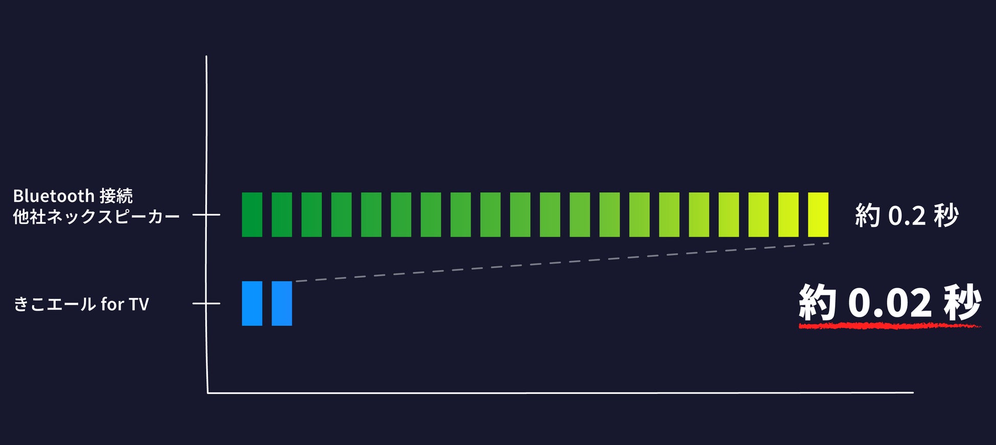 TVにはBluetoothを搭載していない製品があったり、Bluetoothを搭載していてもバージョンが古い製品が多くあります。そのため、きこエール for TVでは赤外線でのデジタル転送方式を採用いたしました。また、赤外線通信は一般的なBluetoothよりも遅延が0.02秒と少なく、音ズレがほぼありません。映像と音を一緒に楽しむことが可能になっています。