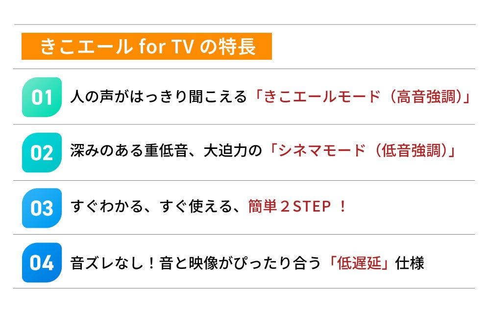 ニュースキャスターの声、映画・ドラマのセリフなど、聞こえづらいと困る「人の声」を大きくする「きこエール」モードを搭載!