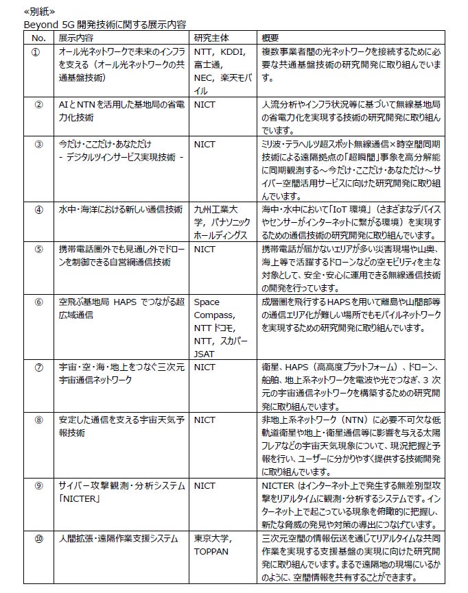 展示では、地上と宇宙・空・海を電波や光でつなぎ三次元の宇宙通信ネットワークを構築するための研究開発、現実世界から集めたデータに基づきコンピュータ上に現実世界のコピーを作り予測等を可能にするデジタルツインの研究開発、空飛ぶ基地局「HAPS」を用いて離島や山間部等の通信エリア化が難しい場所にもモバイル通信を提供する研究開発など、10の最先端技術について紹介します。
