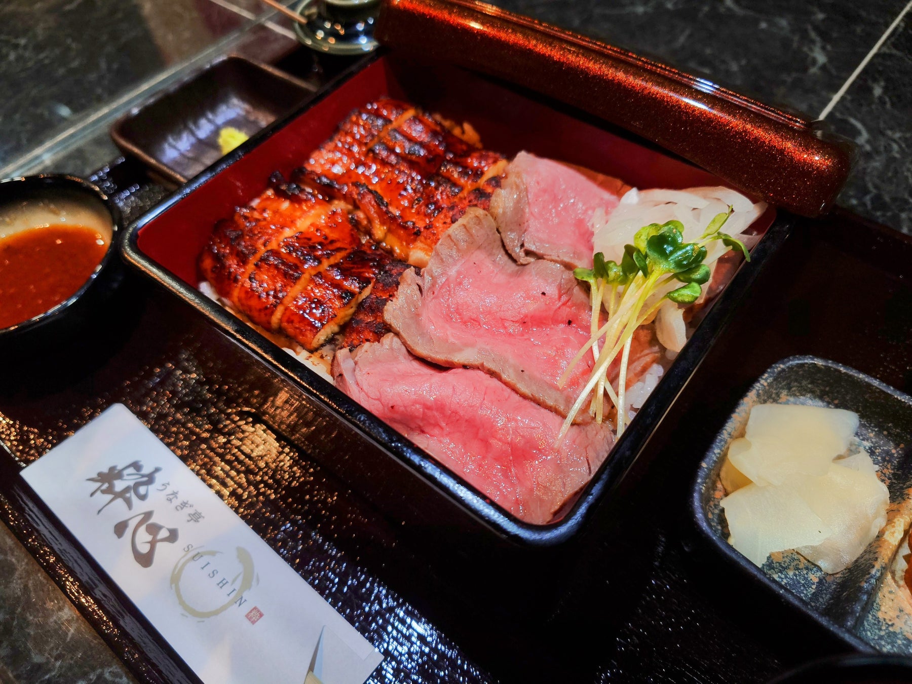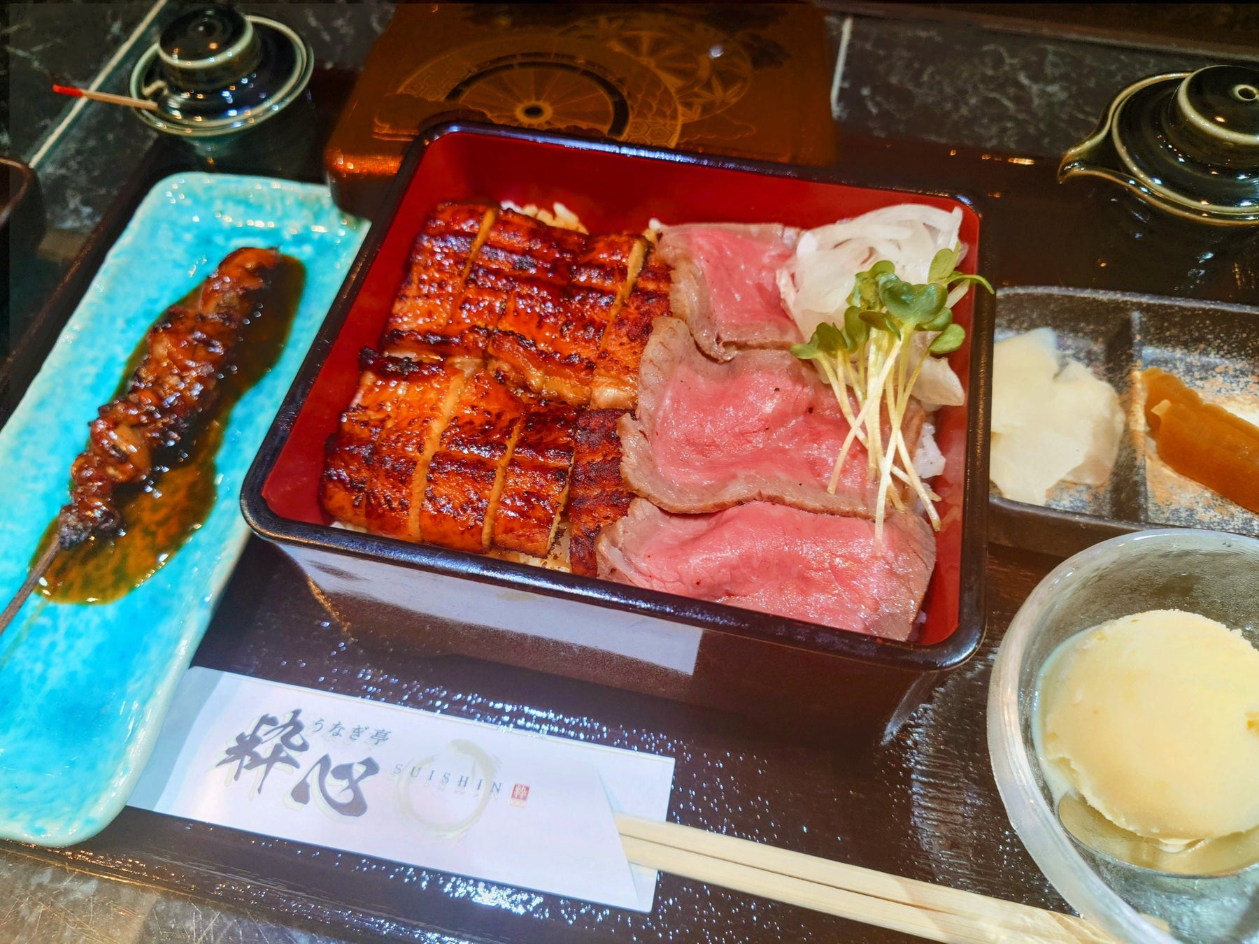 当店自慢の、厳選されたニホンウナギの蒲焼とA5ランクの国産黒毛和牛のローストビーフを半分づつお重に乗せた贅沢の極みといえる一品です。