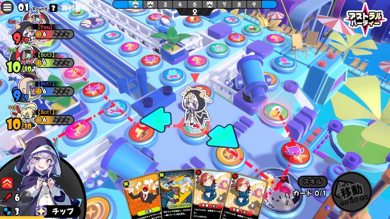 『アストラル☆パーティー』は、最大4人で遊べるパーティーゲームで、キャラクターと手札を戦略的に組み合わせ、「協力×対戦」のハイブリッド体験が特徴。ポップなキャラクターたちと、運と戦略が絡み合うカオスなバトルが楽しめます!