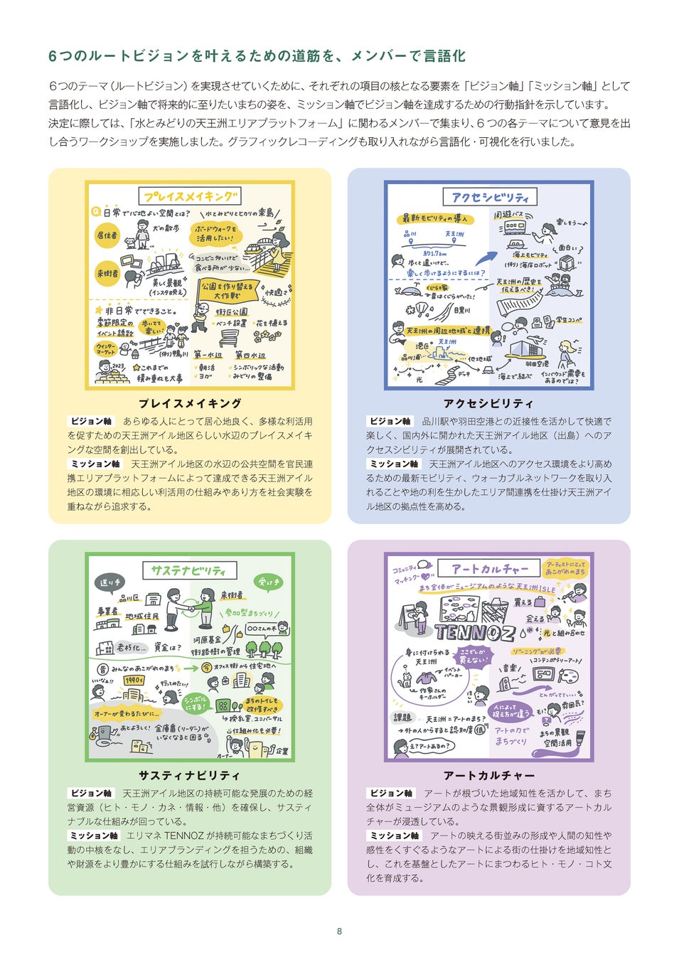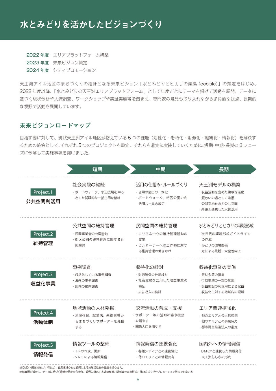 今回公開した資料『水とみどりとヒカリの楽島 天王洲の今と未来 〜官民連携のまちづくり「水とみどりの天王洲エリアプラットフォーム」活動記録〜』には、天王洲アイル地区が今のまちの形となるまでの歴史的変遷から、「水とみどりのエリアプラットフォーム」が2023年に策定したまちづくりの指針となる未来ビジョンの内容、そのビジョンを実現するためのための各種取り組み事例までを集約。これを読めば天王洲アイルで行われてきたまちづくりの概要がつかめるようになっています。