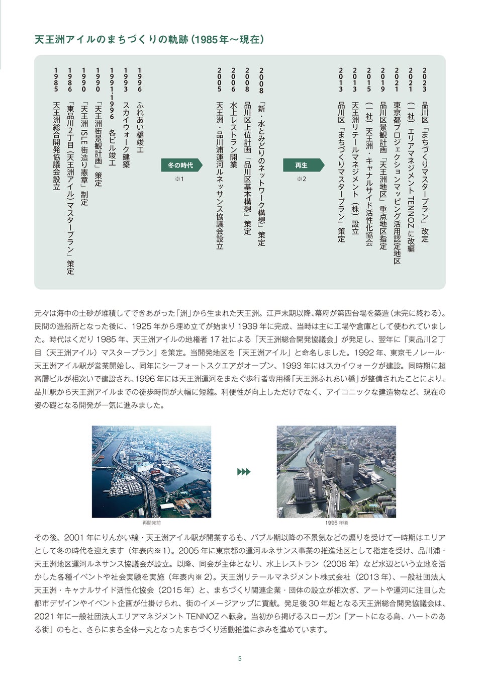 また、本資料は天王洲アイル地区のまちづくりの概要をわかりやすくお伝えすることを第一義として制作したものです。取り上げた情報は、これまでに実践してきた取り組みのごく一部になりますので、より詳細についてご関心がある方はお気軽にお問い合わせください。