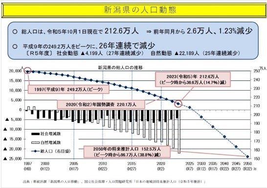 このように新潟県には大きな可能性があるものの、一方で人口は1997年の249.9万人ををピークに減少を続けています。人口減少の主な原因は若年層の県外流出と言われており、総務省が発表した2024年の新潟県の転出超過数は5782人と、全国で9番目の多さです。全国的にも各自治体で人口減少が問題視されていますが、新潟県でも深刻な状況となっています。