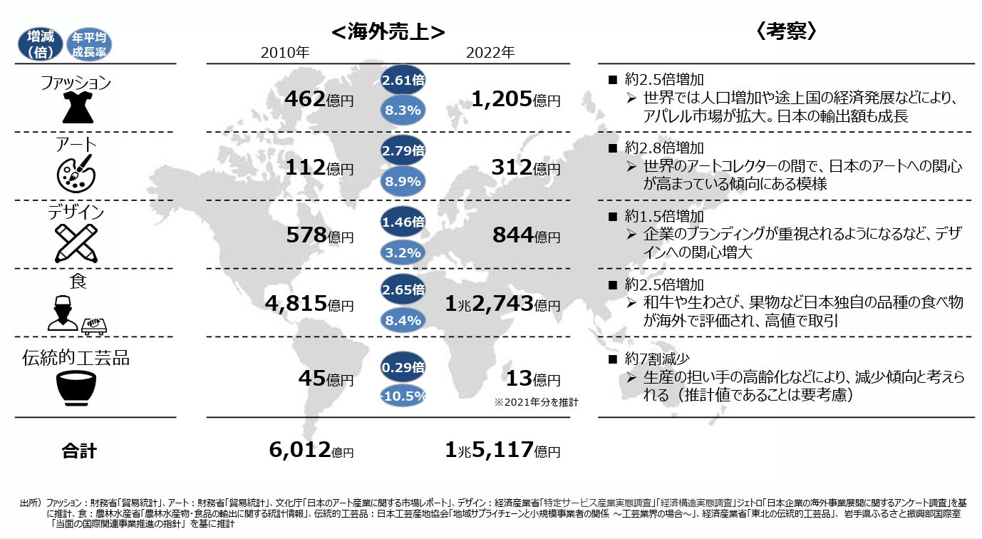 近年、日本のエンターテインメント産業は世界的に注目を集めています。経済産業省が発表したアニメや音楽などのエンターテインメント産業の海外展開などに関する戦略の中間とりまとめ案によると、現在、日本のコンテンツ産業の海外売り上げは、約5兆8千億円で、鉄鋼産業や半導体産業に匹敵する規模とされています(※1)。政府はコンテンツ産業を国の基幹産業と定め、2033年には20兆円まで伸ばす目標を定めています。コンテンツ産業には日本独自の文化や創造性が色濃く反映されており、他国のエンタメ産業と差別化された魅力を持っています。また食の輸出額についても、この10年で大きく伸長しており、日本独自の食が海外で評価され、約2.5倍増加しています(※2)。