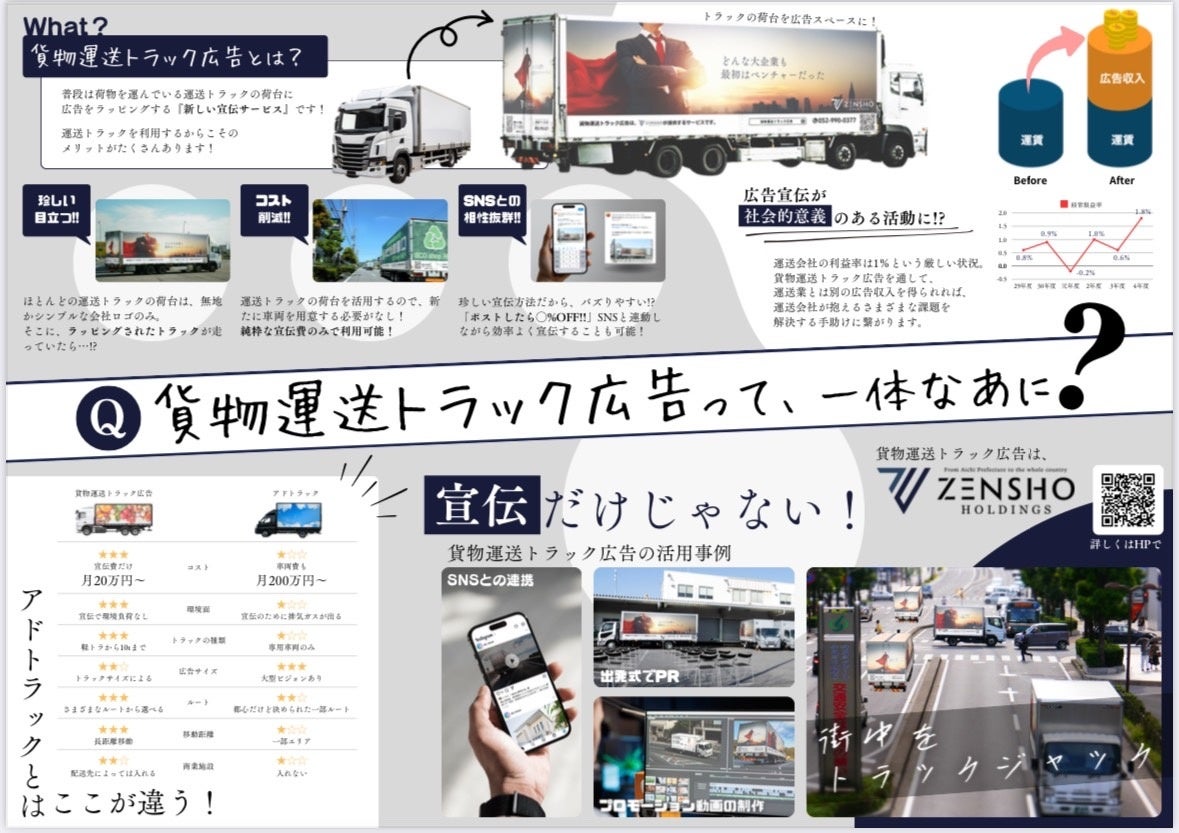 ZENSHO HOLDINGS合同会社(本社:愛知県)は、広告の常識を覆す斬新なプロジェクトとして、全国の公道を走るトラックを広告媒体化する『貨物運送トラック広告』サービスを本格始動しました。