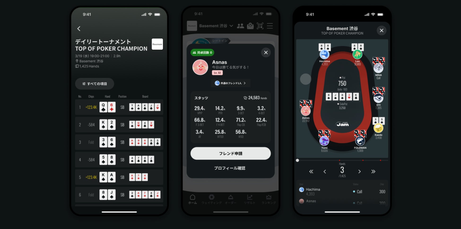 ユーザーは、ポーカースポットを検索できるだけでなく、戦績、フードやドリンクの注文・決済、フレンドと位置情報の共有などが可能です。