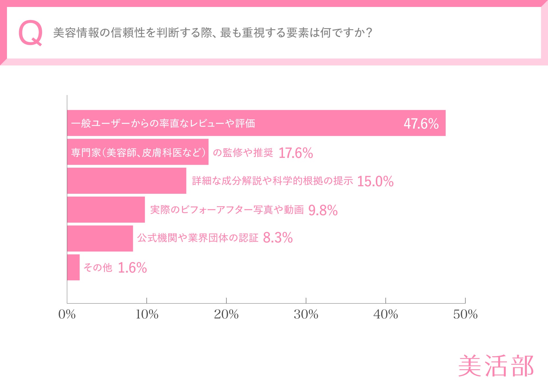美容情報の信頼性を判断する際、最も重視する要素として「一般ユーザーからの率直なレビューや評価」が47.6%と圧倒的に高い支持を得ました。これに「専門家の監修や推薦」(17.6%)、「詳細な成分解説や科学的根拠の提示」(15.0%)が続いています。