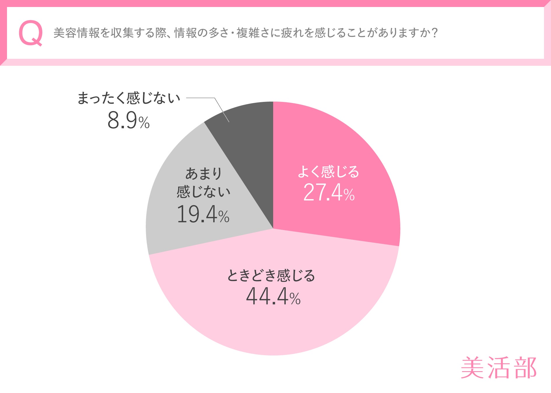 調査では、美容情報の多さや複雑さに「よく疲れを感じる」(44.4%)または「ときどき感じる」(27.4%)と回答した女性が合計で71.8%に達しました。これは、現代社会における「情報過多」の問題が美容分野にも当てはまることを示しています。