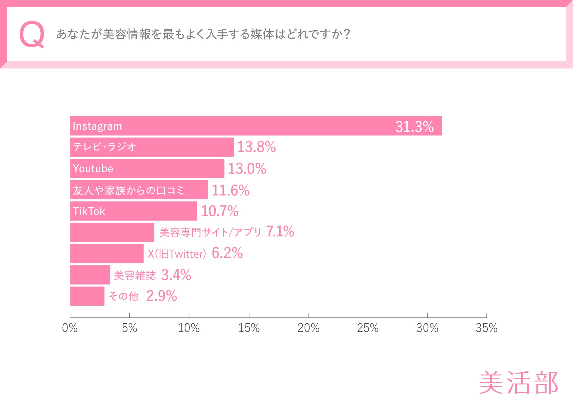 調査結果から、美容情報の収集においてSNSが主要なメディアとなっていることが明確に示されました。特にInstagramが31.3%と最も高く、YouTube(13.0%)、TikTok(10.7%)、X(旧Twitter)(6.2%)を合わせると、SNS全体で61.2%に達します。これは従来の情報源であったテレビ・ラジオ(13.8%)や美容雑誌(3.4%)を大きく上回っています。この結果は、視覚的な情報や実際の使用感を動画で確認できるといったSNSの特性が、美容情報の収集に適していることを示唆しています。
