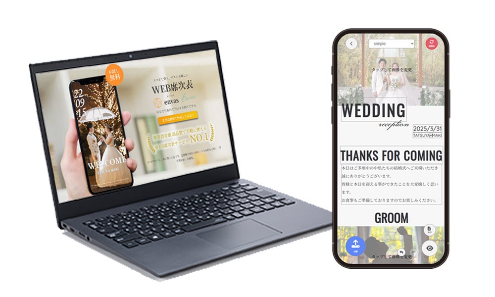 「envas」は、画面上のレイアウトを見ながら、文字や写真をそのまま編集できるWEB席次表サービスです。