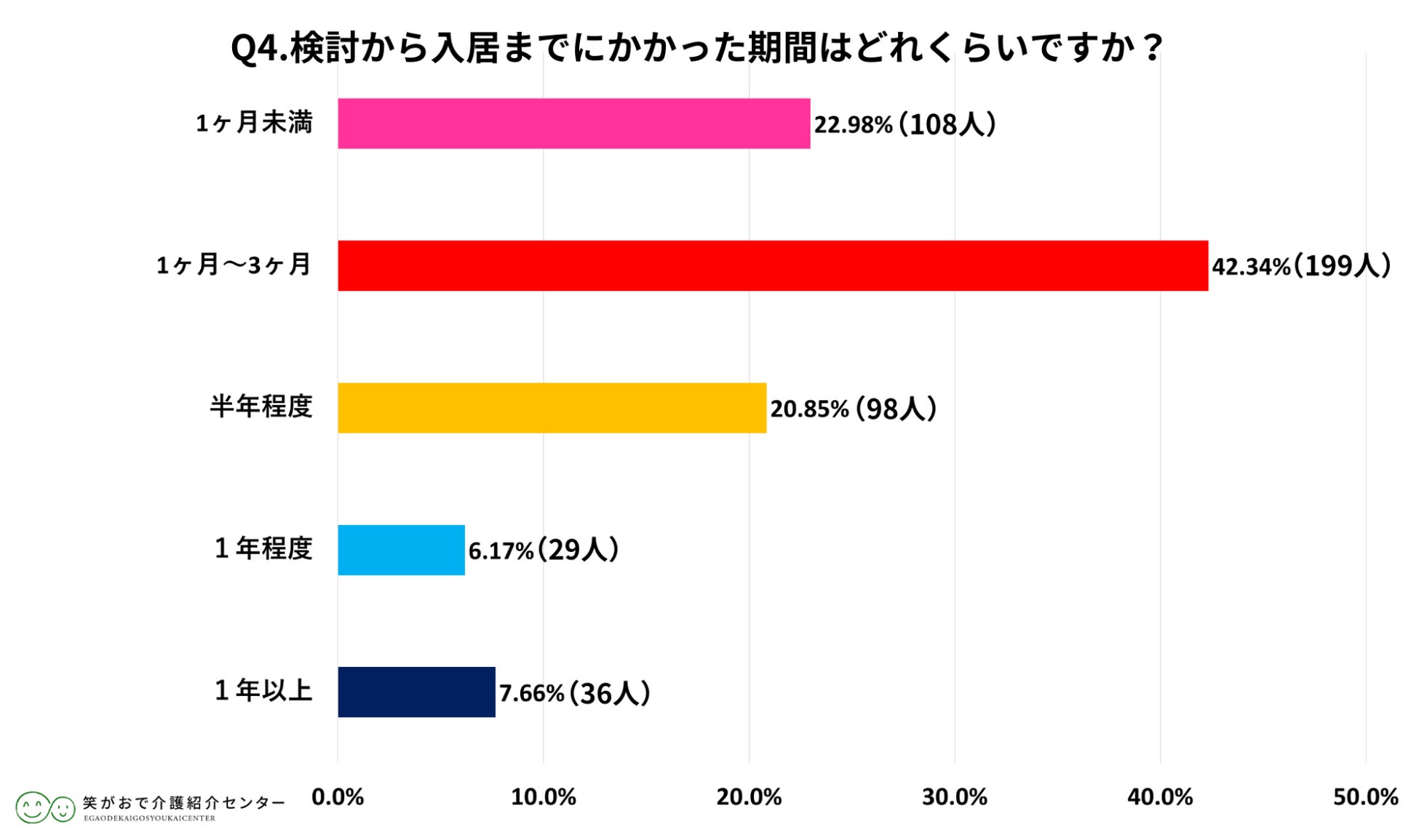調査結果③の内容も踏まえると、大半の方が検討からなるべくスピーディに施設を決める傾向が見られます。