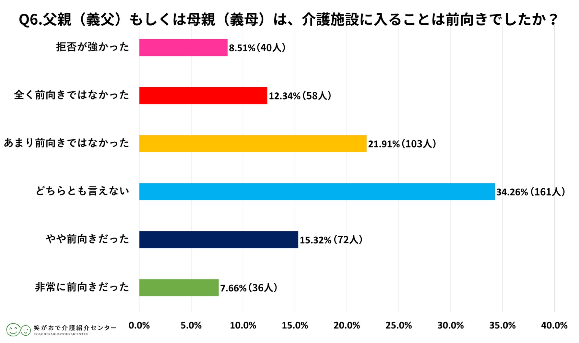 調査結果⑥|父親(義父)もしくは母親(義母)は、介護施設に入ることは前向きでしたか?