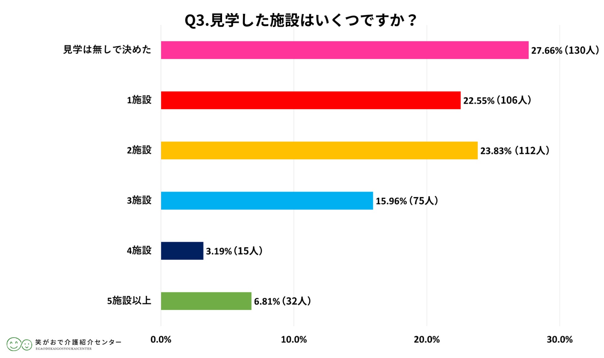 最も多かったのは「見学は無しで決めた(27.66%)」、次いで「2施設(23.83%)」という結果になりました。