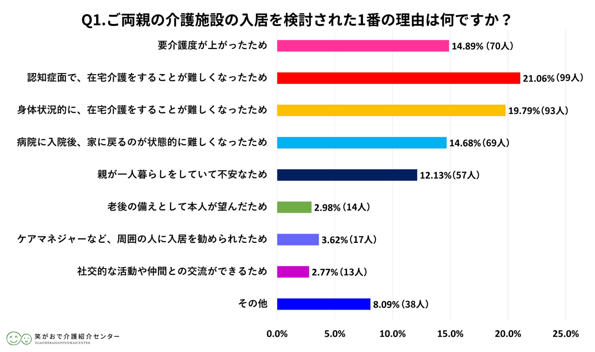 最も多かった理由は「認知症面で、在宅介護をすることが難しくなったため(21.06%)」でした。