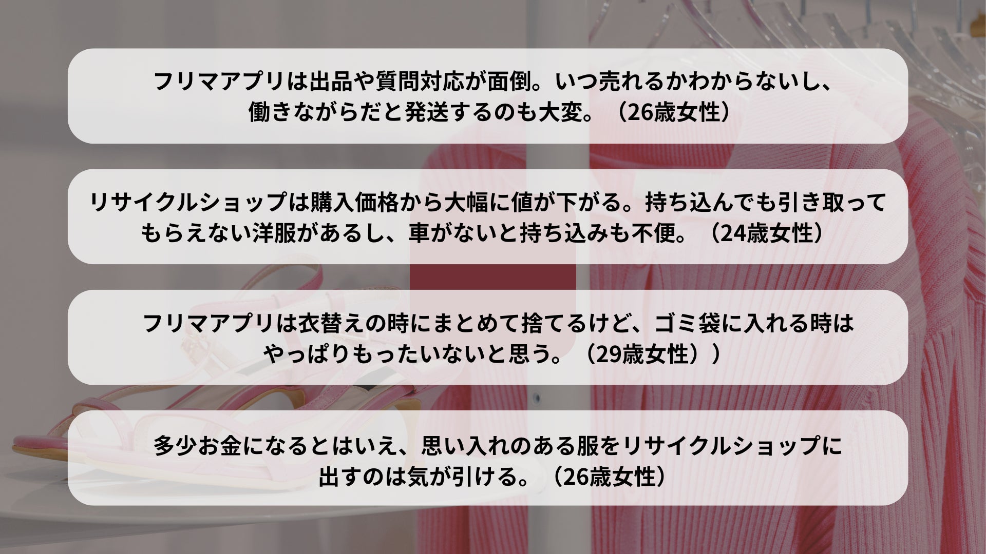 20〜30代の女性68名にヒアリングを行ったところ、多くの人が「もったいない」と思いつつも服を手放せず、結局は捨ててしまう理由として、こんな声がありました。