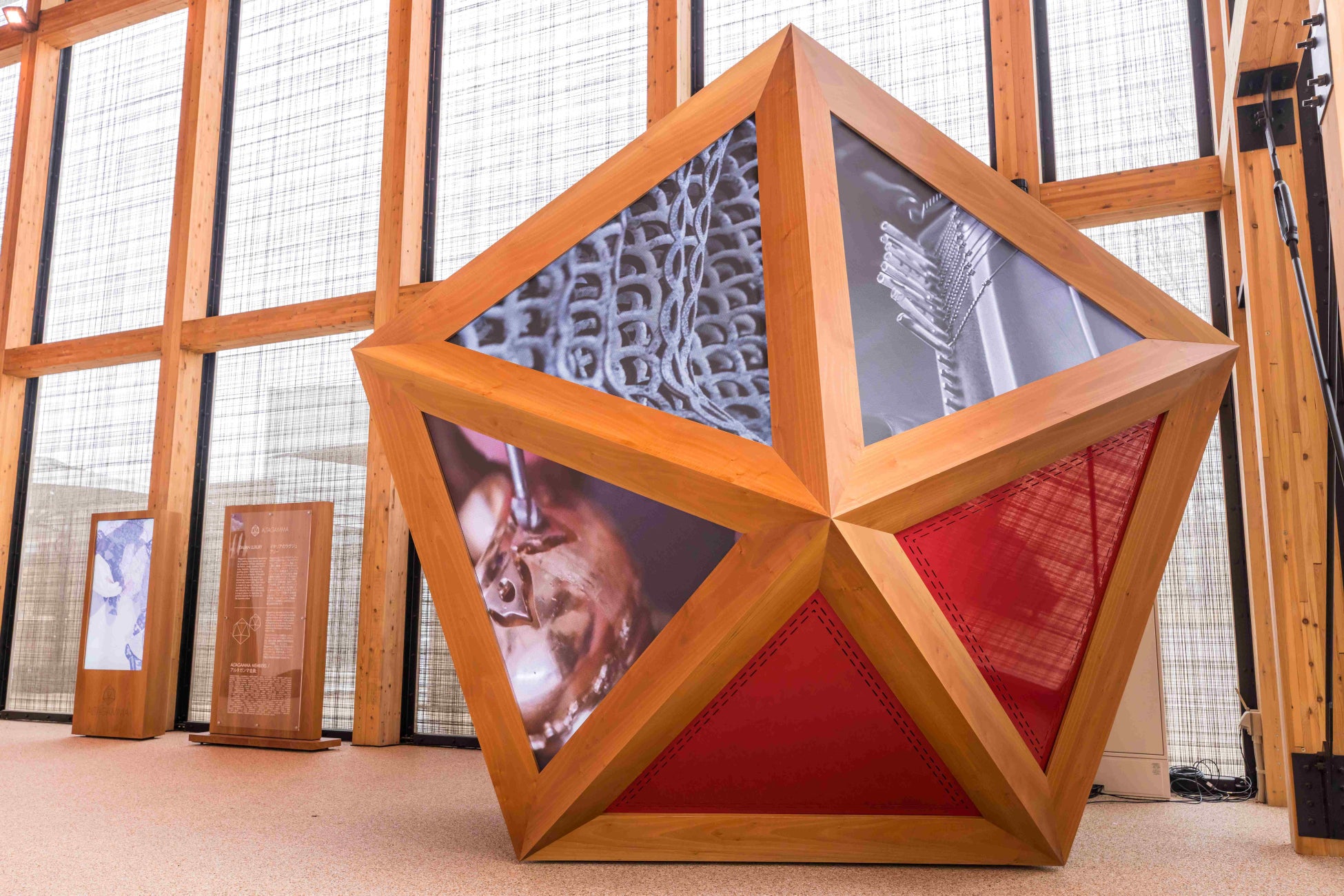 アルタガンマ・アイカサヒドゥランは、ウォールナット材で作られた幾何学的な構造物で、イタリアのハイエンドなクラフトマンシップの世界の印象的で記憶に残る体験を提供します。レオナルド・ダ・ヴィンチがデザインし、ルカ・パチョーリが描いた有名な多面体から着想を得たアイカサヒドゥランは20の三角形で構成され、そのうち6面ではアルタガンマに加盟する120ブランドの映像を通じて、イタリアの製造業の驚くべき多様性を人々に示すとともに、クラフトマンシップとホスピタリティアートを起業と産業の成功モデルへと高めてきた、産業地域に形成された広範な専門技術と知識を紹介しています。