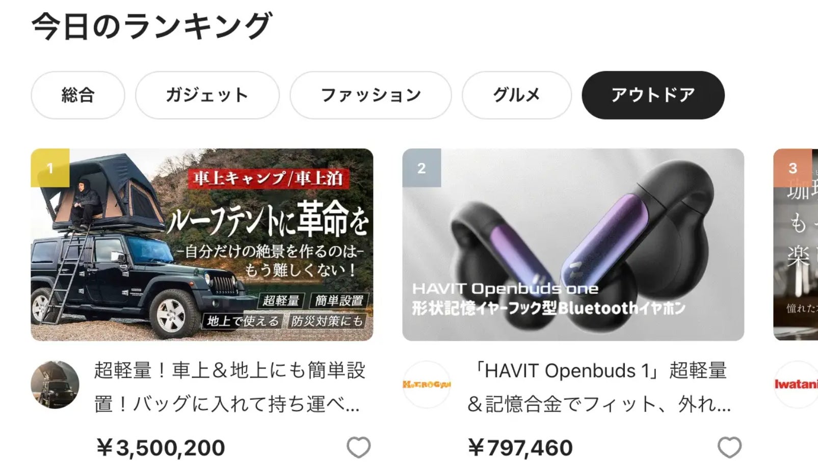 開始5分で目標金額を達成、総合ランキングで2位、アウトドア部門では堂々の1位を獲得