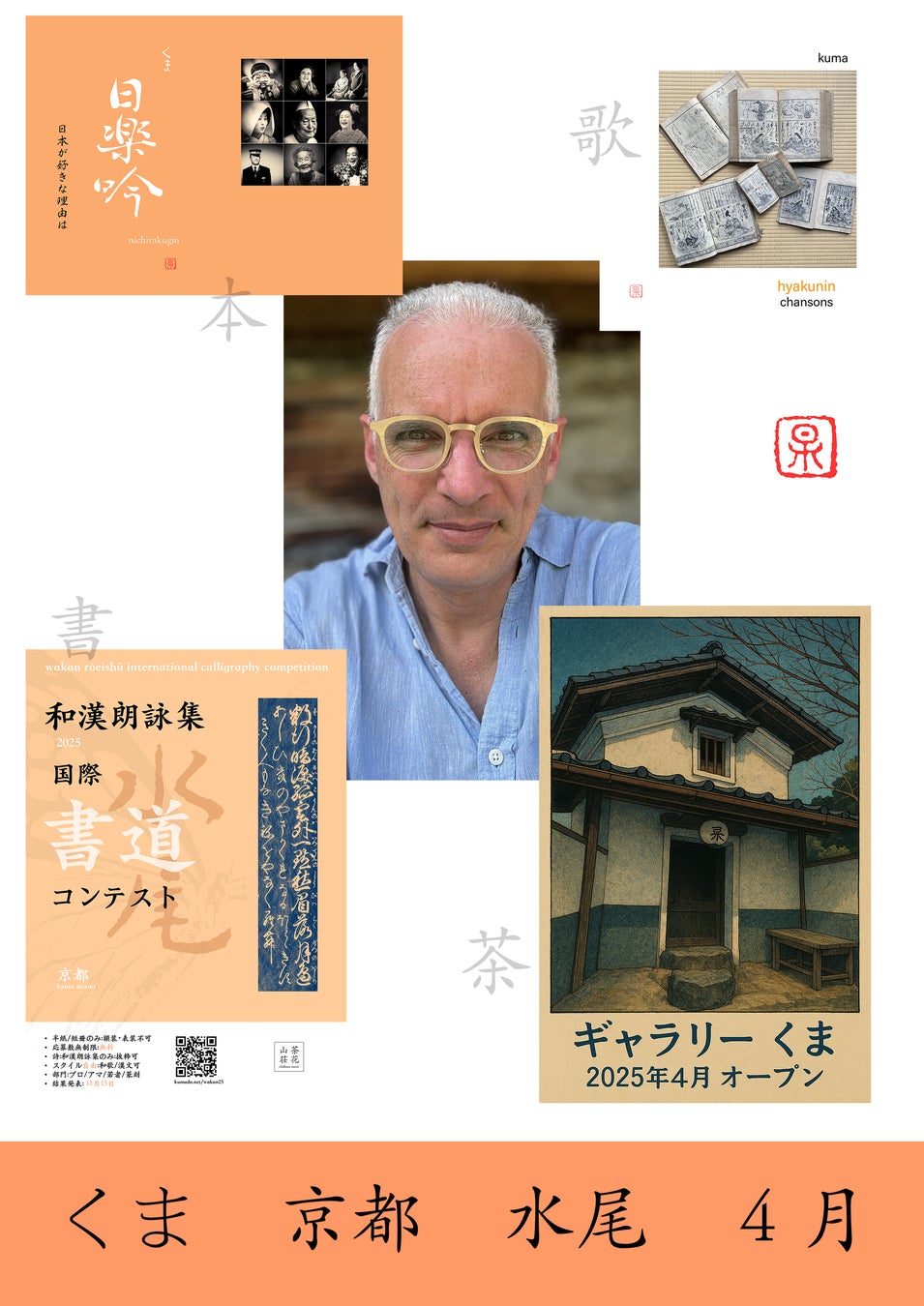 京都・水尾に拠点を構えるフランス人アーティスト kuma(クマ) は、千年の時を超えて響き続ける日本の詩と美に、現代の感性で向き合ってきました。音楽、書、出版、陶芸という四つの創作を通じて、今なお燃え続ける日本文化の核心に光を当てます。