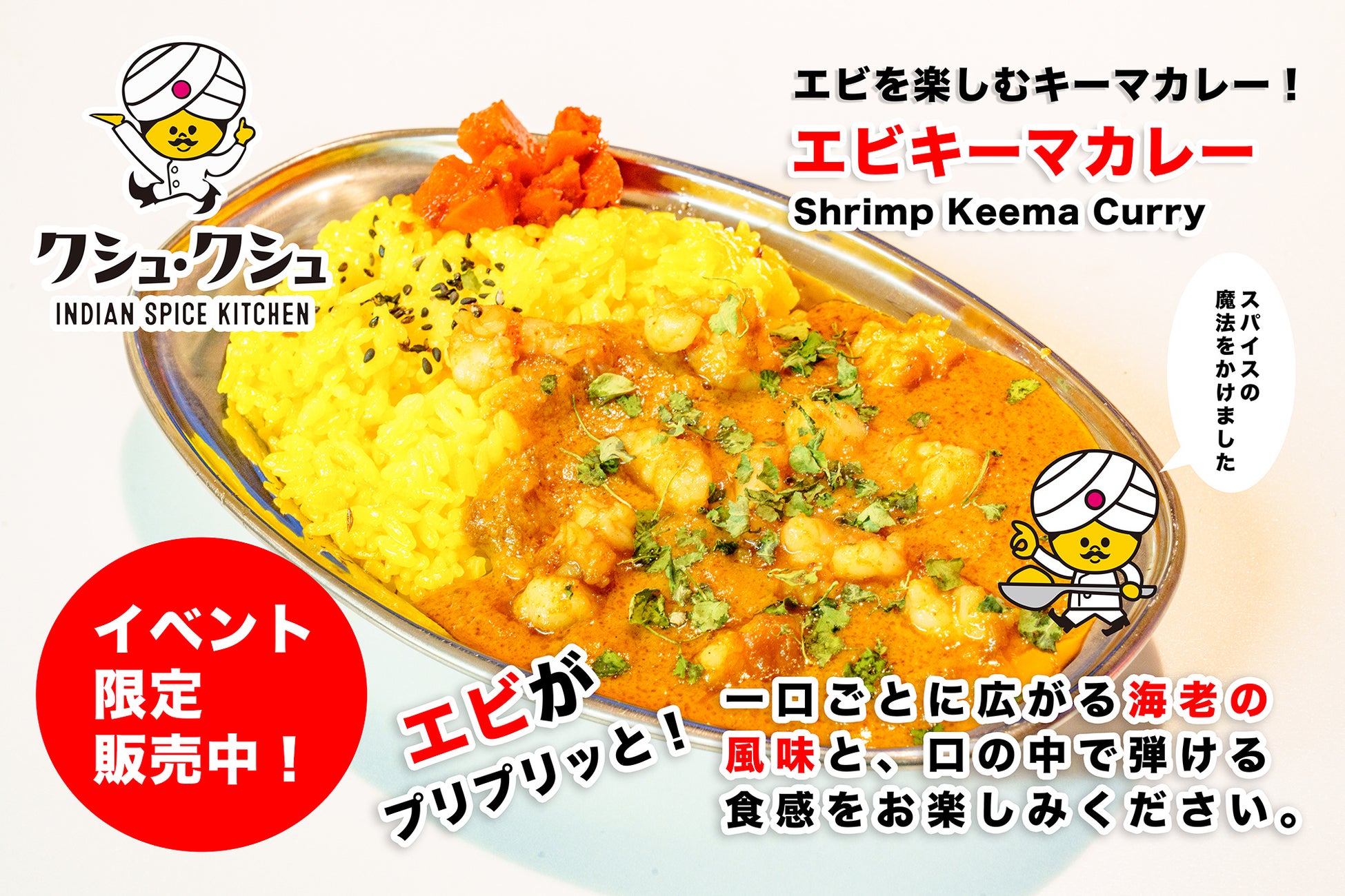 【ぷりぷりエビキーマカレー ─ 海老の旨み×伝統スパイスの黄金比】 イベントのメイン商品。インド伝統の一族に受け継がれたスパイスレシピで作る、エビの旨みがギュッと詰まったぷりぷり食感のキーマカレー。スパイスの香りと海老の甘みが絶妙に絡み合う、クセになる一品です。