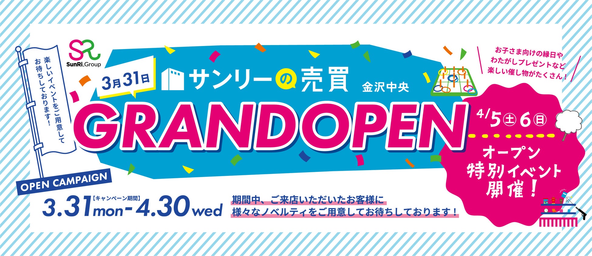 株式会社サンリーバイカイは、金沢市中央通町に新店舗となる不動産売買・買取・リフォーム専門店「サンリーの売買 金沢中央」を開店いたしました。グランドオープン日は3月31日(月)。4月30日(水)までの間、ご来店プレゼントやお菓子つかみ取りなどを含む、オープンキャンペーンを開催いたします。