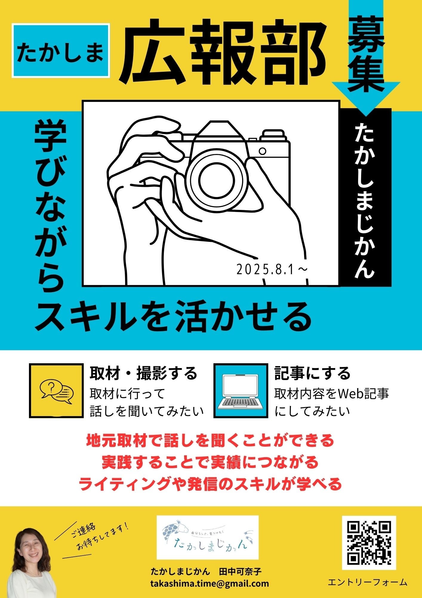 メディアでの勤務経験などを活かし、地域情報サイト「たかしまじかん」を2016年に開設。2020年に貸スペースwaccaをオープン。2024年にPR会社を設立。代表として、PR広報や起業支援などを通じ「全ての可能性が輝く社会」を目指し活動する。
