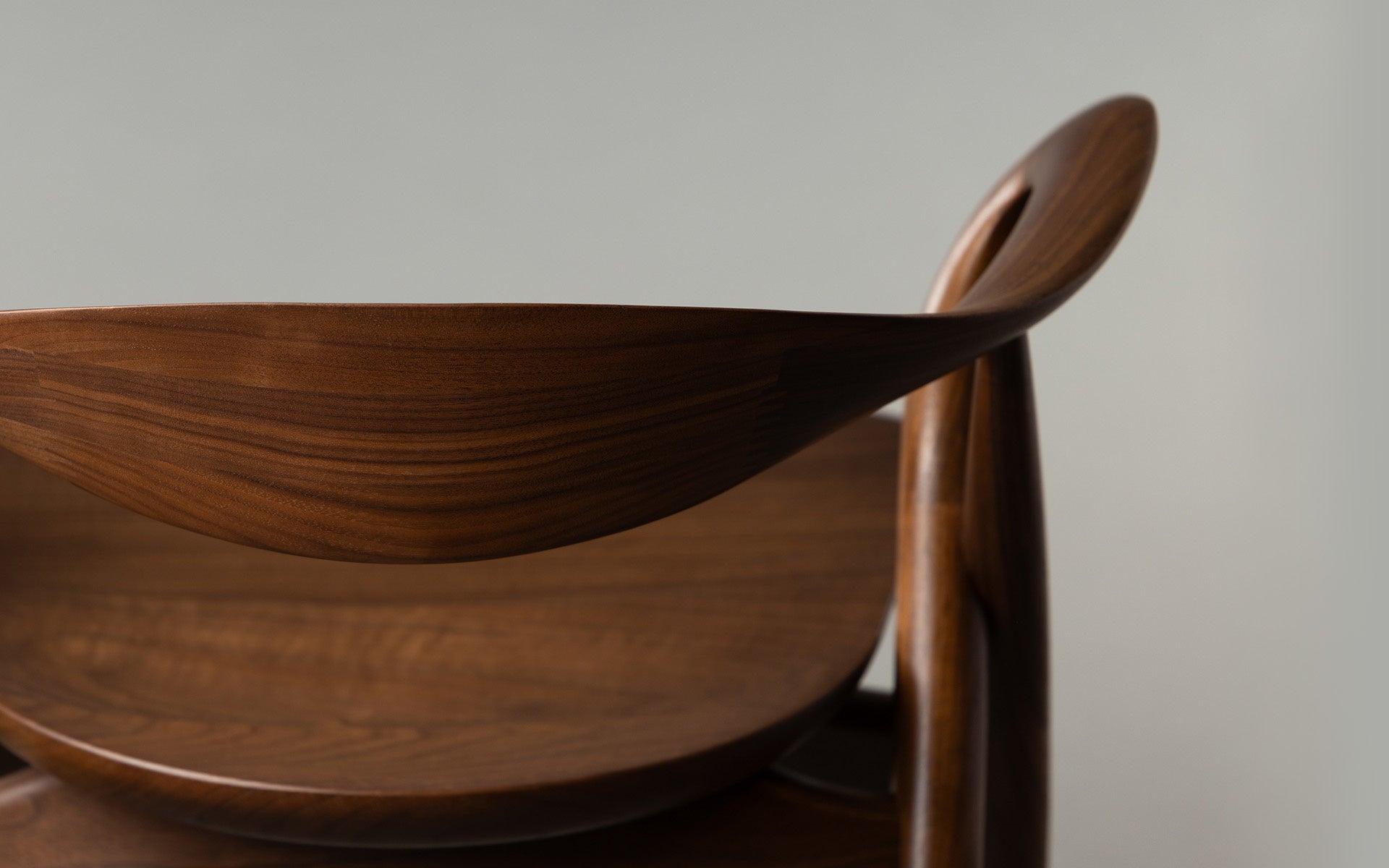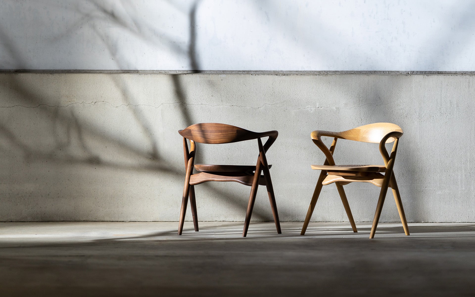当社の削り出し技術による美しい曲線と繊細な造形が特徴です。直線や平面を極力排し、自然界に見られるような優雅な曲線美を採用しました。どの角度から見ても美しく、デザイン性だけでなく、快適な座り心地も徹底的に追求しました。
