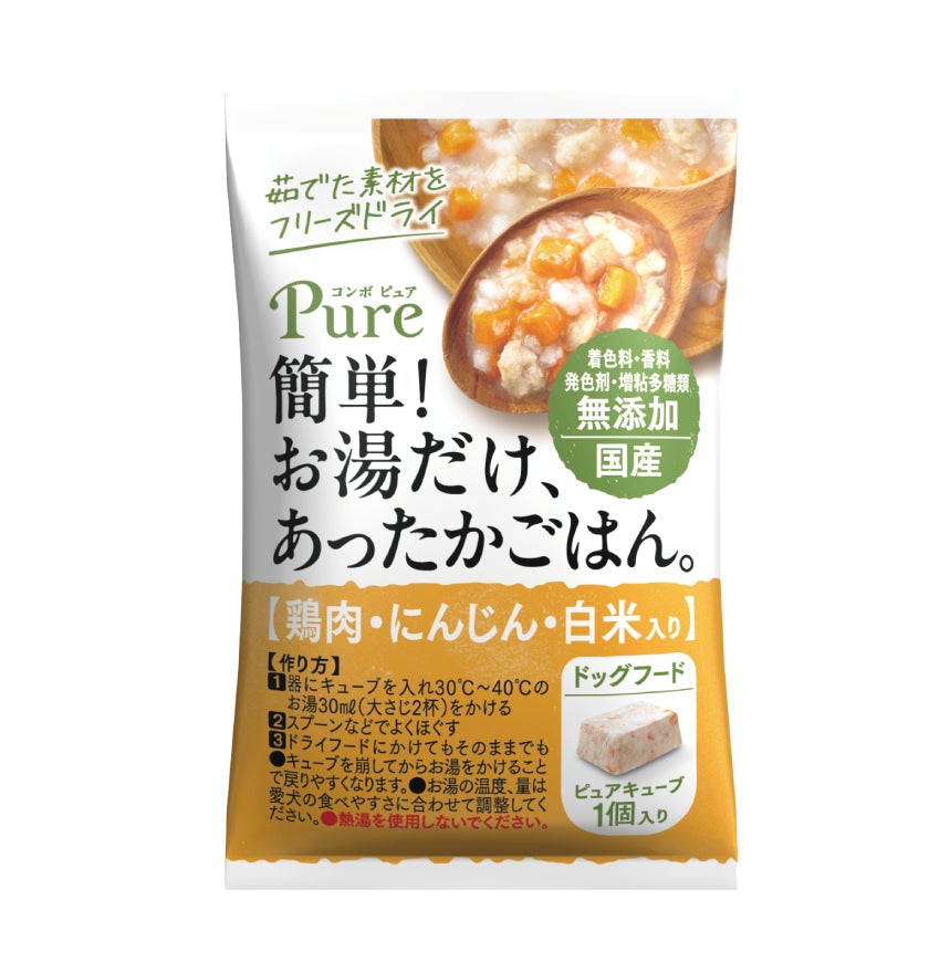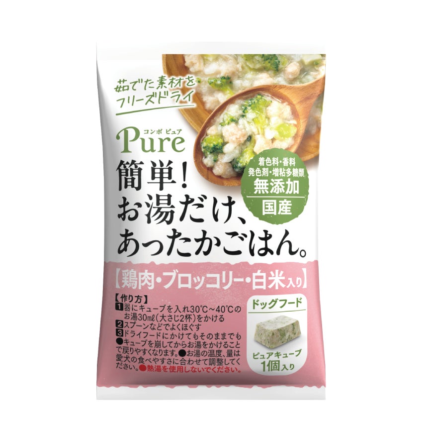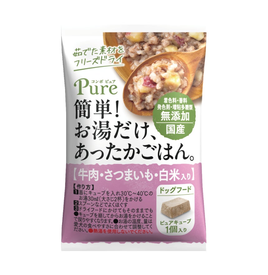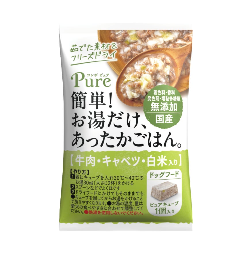 ピュアキューブは素材のおいしさをそのままフリーズドライにしているから、お湯で戻すだけの手軽さ。愛犬とオーナーさんの日々を“ちょっと”特別にします。