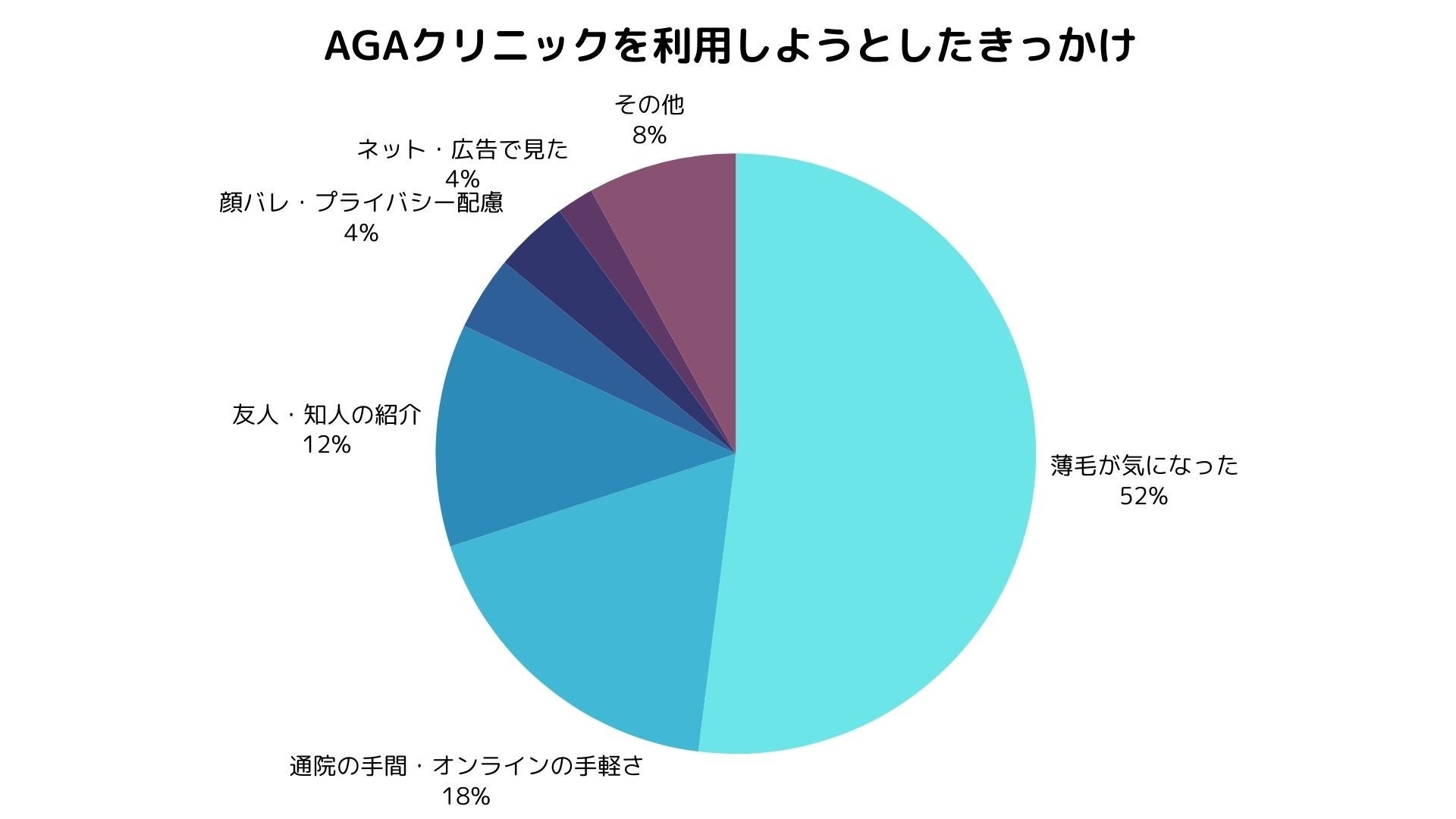 アンケートから見えてきた、AGAクリニックを利用しようと思った主なきっかけは、「実際に薄毛の進行を実感したこと」と「周囲の視線が気になりはじめたこと」でした。