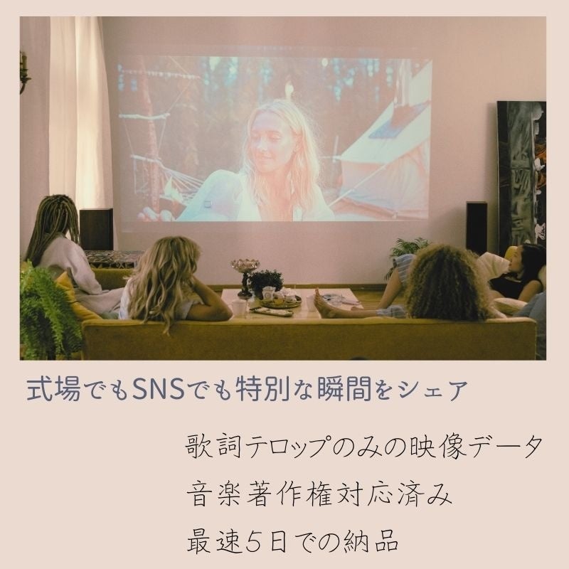 ・歌詞テロップ付き動画ファイルとして納品:プロフィールムービー制作に適した、歌詞のタイミングに合わせたテロップ入り動画形式(制作環境に合わせてデータ形式を選択可能)で納品。
