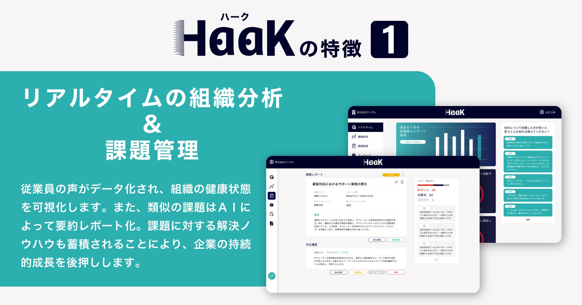このような背景のもと、HaaKは従業員の声を見える化し、組織として細部への目配り、自由で正直な組織内コミュニケーション、情報の公平性を実現することで企業の持続的成長を支援するために開発されました。