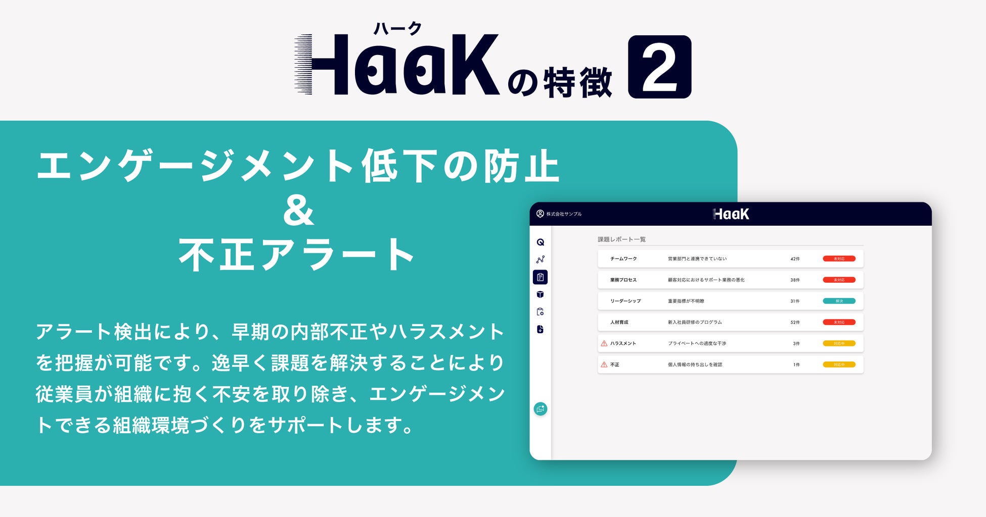 「HaaK」は、従業員エンゲージメントの測定だけでなく、 内部不正やハラスメントの早期発見を可能にする不正検知アラート機能を搭載した次世代型の組織環境向上サーベイです。従業員が日々の業務や組織へのフィードバックを匿名で発信できる仕組みを通じて、企業はリアルタイムに組織の健康状態の把握をおこなえるようになり、適切な対策を講じることができます。