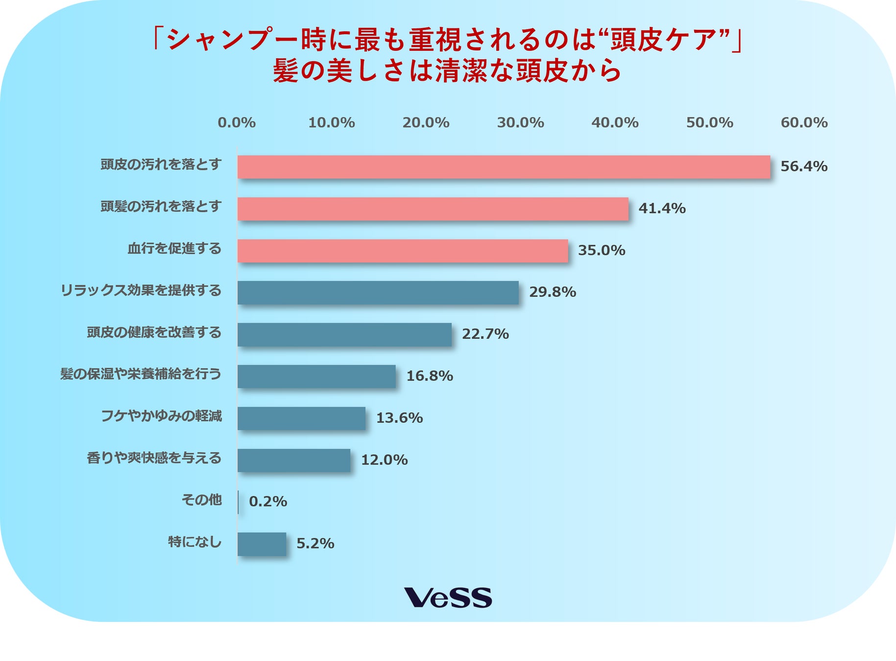 ・シャンプー時に重視している効果、最多回答は「頭皮の汚れを落とす」