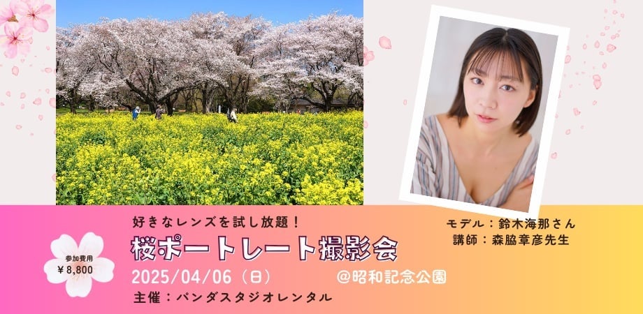 株式会社プロ機材ドットコム(本社:沖縄県那覇市)は、2025 年 4 月 6 日(日)に昭和記念公園にて、パンダスタジオとの協業でパンダスタジオレンズコーナーオープン記念イベント第一弾『春爛漫桜ポートレート撮影会』を開催します。
