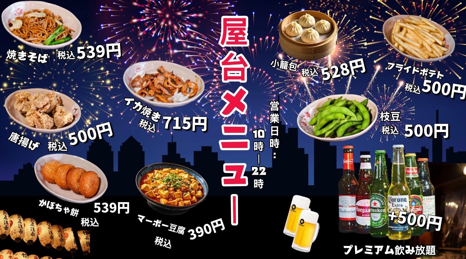数十種類の具材を串に刺して楽しむ中国の火鍋「串串香」をメインに、ビアガーデン定番のおつまみや、お祭りでおなじみの屋台メニューもご用意。様々な味わいを一度にお楽しみいただけます。