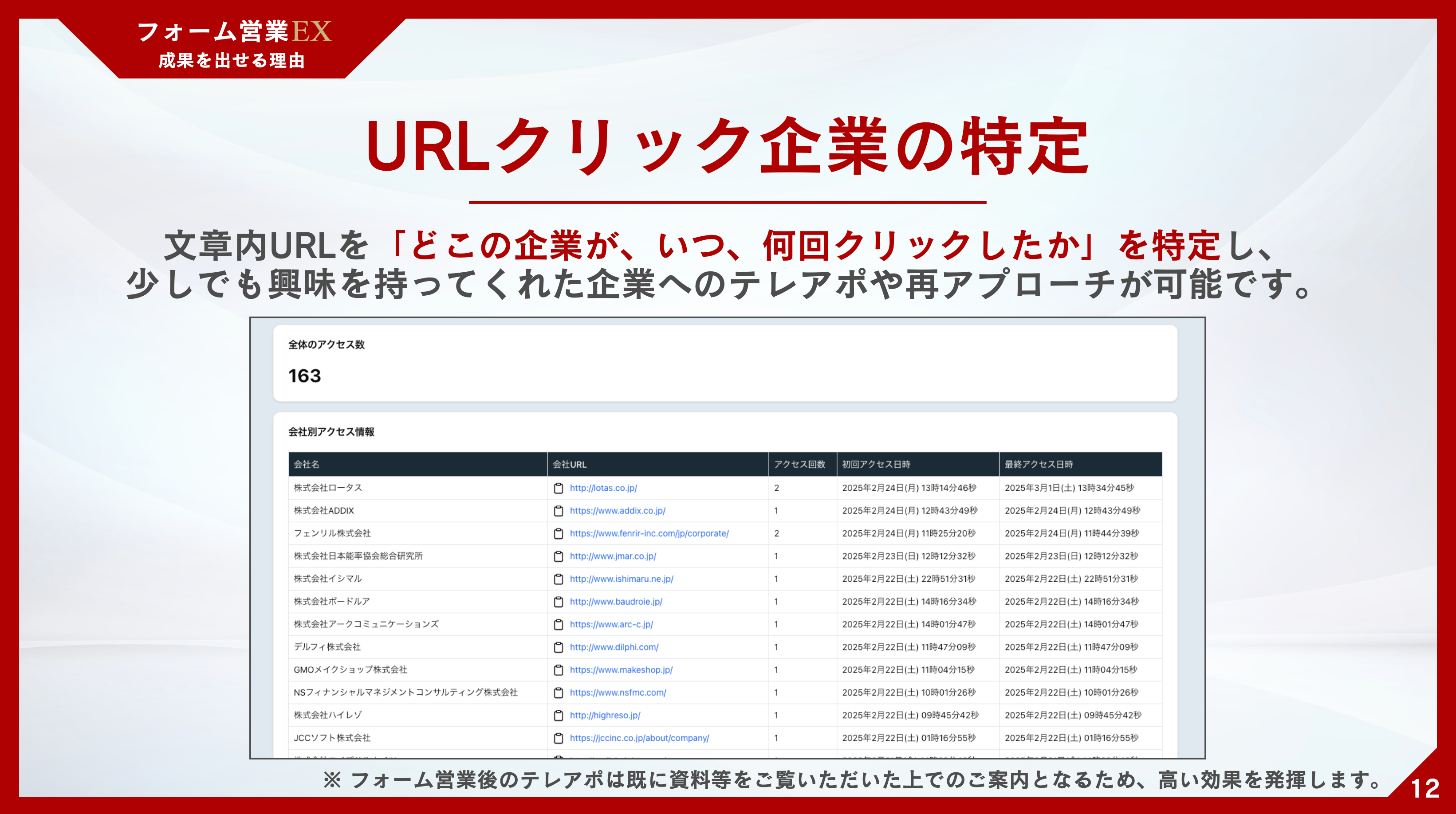 URLクリック企業の特定:文章内URLを「どこの企業が、いつ、何回クリックしたか」を特定し、興味を持った企業への効果的なアプローチが可能