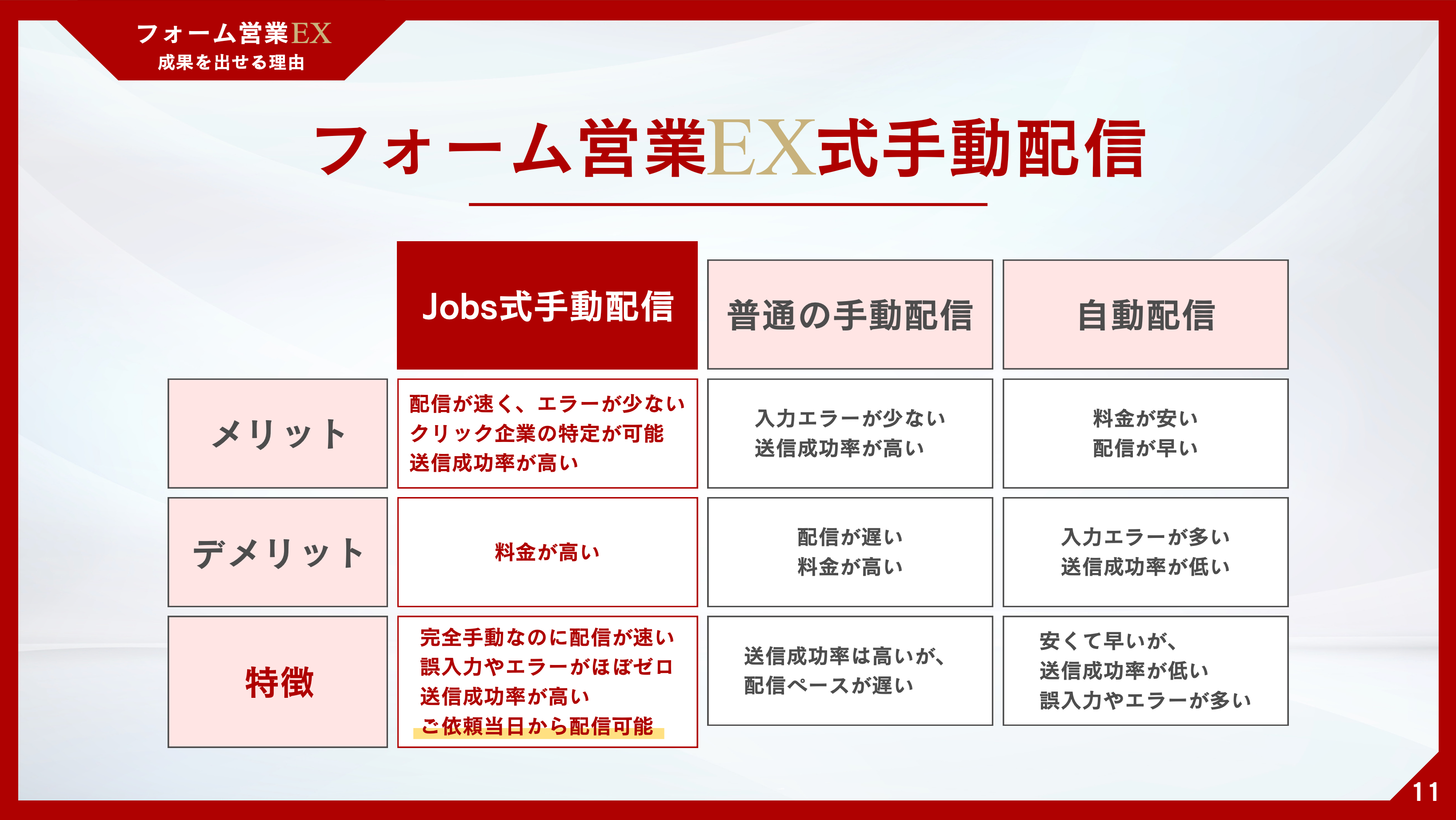 ツールやAIとの違い:人間が1つ1つ手作業で丁寧に配信することで、誤入力が無い&リキャプチャに引っ掛かることなく最大限の送信成功率を実現。