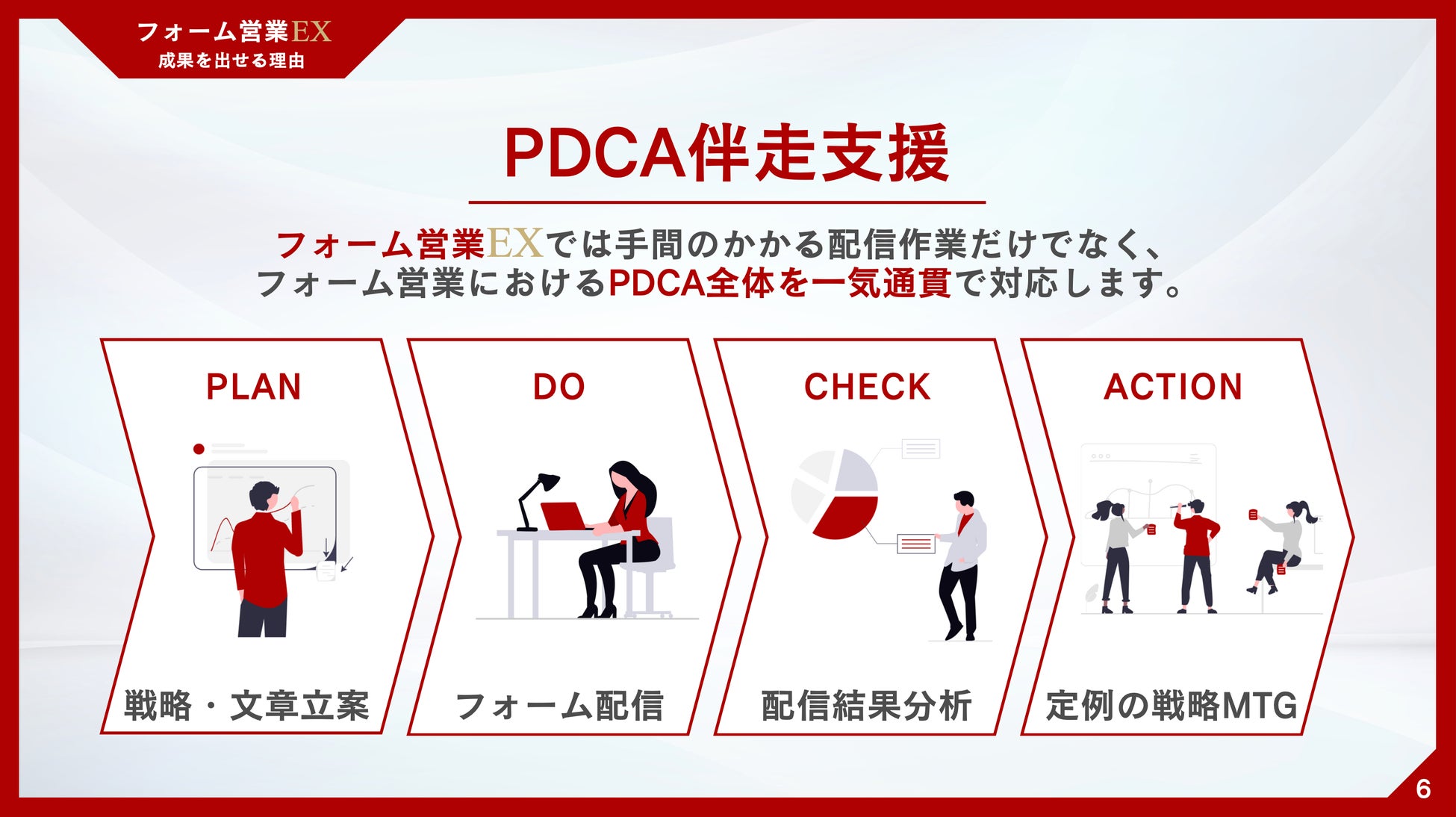 フォーム営業EXでは手間のかかる配信作業だけでなく、フォーム営業におけるPDCA全体を一気通貫で対応。戦略・文章立案から配信、結果分析、そして定例の戦略ミーティングまでをトータルでサポートします。
