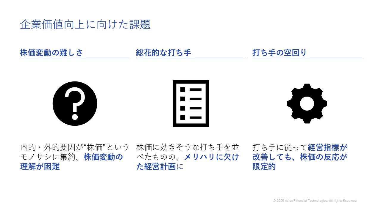 経営戦略×ファイナンス×テクノロジーを融合し、AIによる企業価値向上インサイト創出を手がけるAxios Financial Technologies株式会社(本社:東京都中央区、代表取締役CEO:榎本 佳朗)は、企業価値向上支援サービス「Value Lever Finder」の本格提供を開始いたしました。