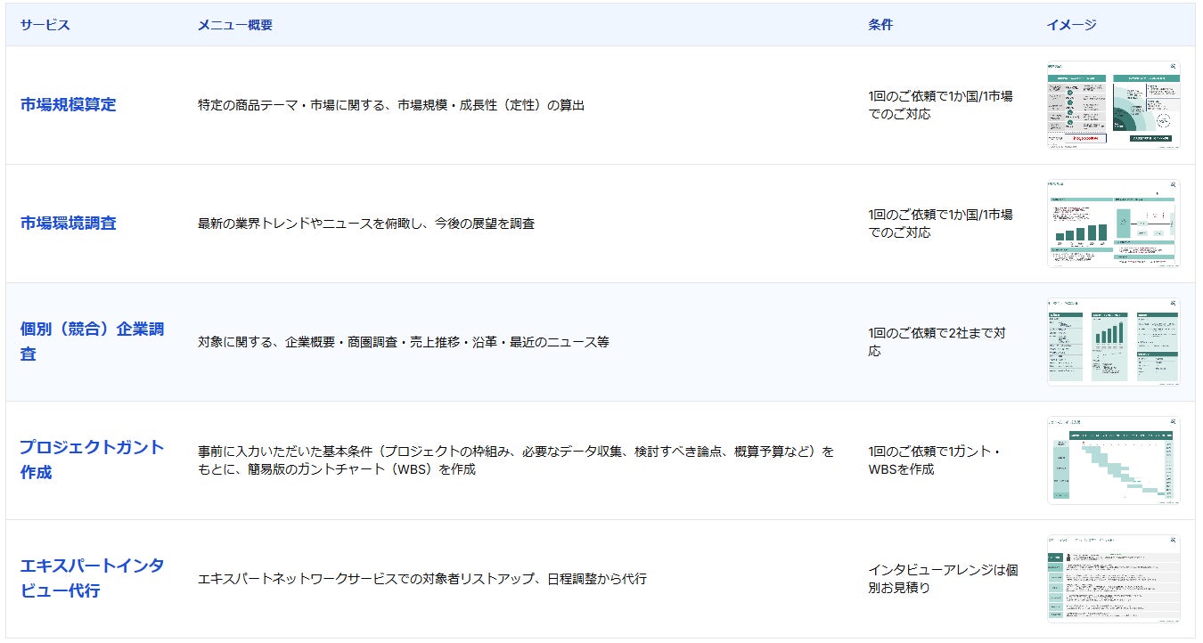 幅広い調査メニュー: 市場規模の算定や業界トレンドの調査、競合企業の詳細リサーチからプロジェクト計画(ガントチャート)作成、さらには専門家インタビューの手配まで、ビジネス上の幅広いリサーチニーズに対応します。これにより、企業の成長段階や直面する課題に応じた柔軟なサポートが可能です。