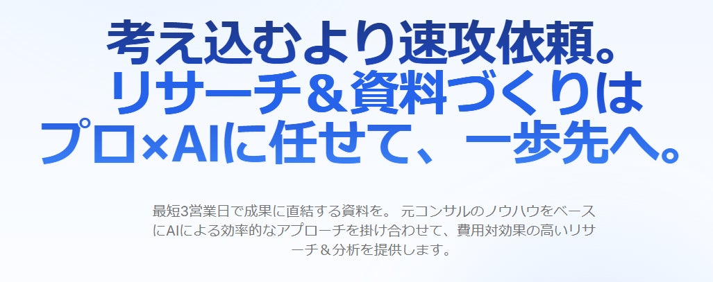 高品質なアウトプット: 調査内容や資料構成はコンサルティング経験者が監修し、ビジネス現場ですぐに使える実践的な資料を作成。論理的に整理されたレポートで、意思決定に役立つインサイトを提供します。