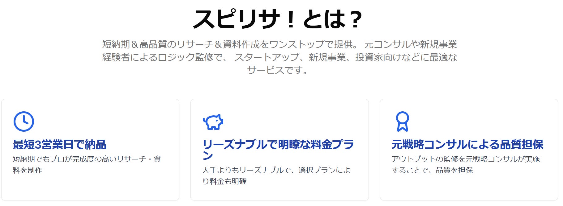 「スピリサ!」は、調査から資料作成までをワンストップで支援するリサーチ&資料作成サービスです。元戦略コンサルタントや新規事業の経験者がロジックを監修し、最新の生成AI技術を活用することで、スピードと品質を両立した調査支援を実現しました。スタートアップの事業計画や新規事業の立ち上げ、投資家向け資料の作成など、ビジネスパーソンが直面する様々なシーンに最適なサービスとなっています。利用者は専用の申し込みフォームから依頼内容を送信するだけで、内容に応じた調査・分析が行われ、最短3営業日で高品質な報告資料が納品されます。