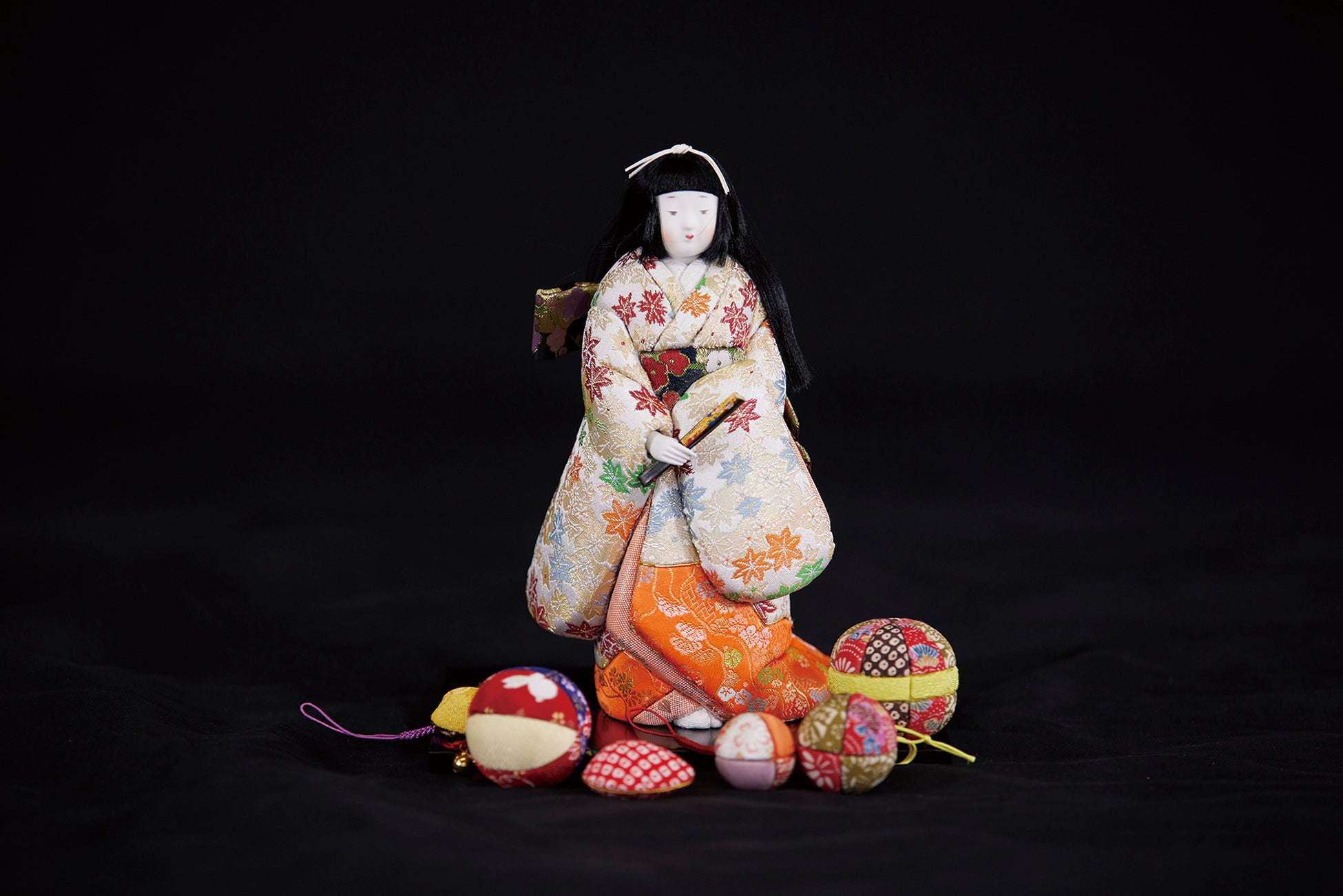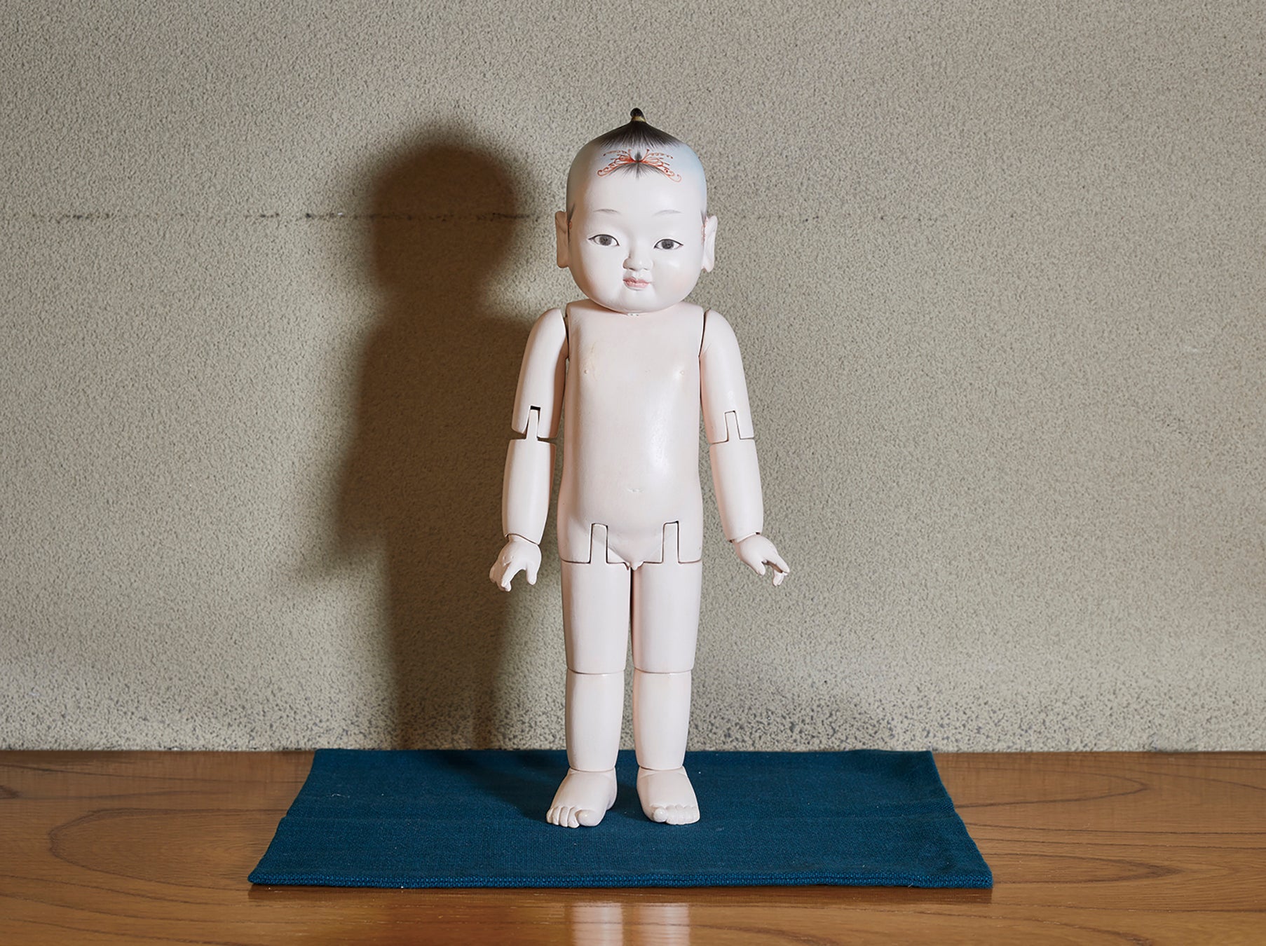 三つ折り人形は日本人形の逸品の一つ。安永元年(1772年)頃に作られた仕組みで、頭・胴・手足を別々に彫ることで膝頭と足が折れ立ち座りが出来ます。木彫りした部品は胡粉を数十回塗り重ね最後に顔を描いて仕上げます。その他の人形は多くのデッサンを基に木を彫り様々な表現方法を用いて世界に唯一の作品を作ります。