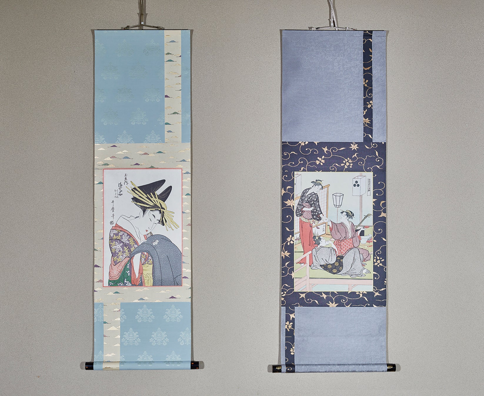 表装の技術は仏教伝来と共に伝わり、江戸時代には文化の発展により上流社会だけでなく、一般庶民にも身近になりました。江戸表具は武家社会の粋な色調が特徴です。表装の技術は、現代のインテリアにも生かされております。