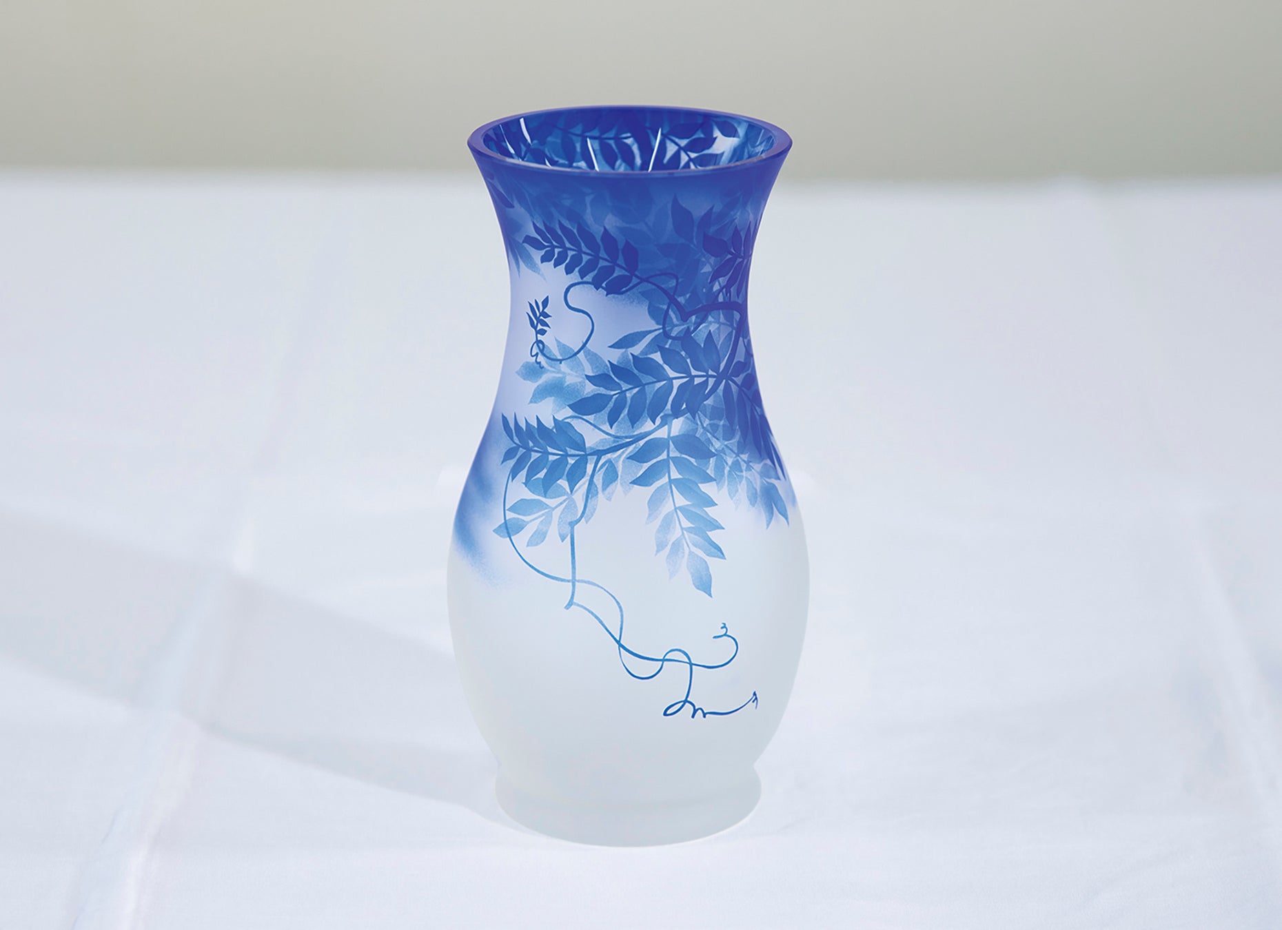 明治時代にアメリカから伝えられたサンドブラスト加工の技術を使い、ガラスの表面を砂状の研磨剤で削る彫刻ガラス。 研磨剤を当てるとガラスの表面は一瞬にして曇り、繊細な小さな模様から立体的な深彫りまで多様な表現が出来ます。 色の濃淡を彫り分けるには高度な技術が必要です。