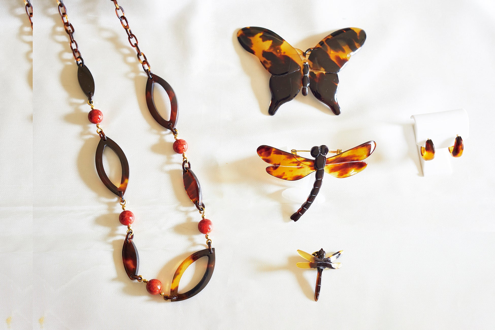 国指定伝統工芸品。べっ甲とは赤道付近(太平洋・大西洋・インド洋)に生息する海亀の一種「玳瑁(タイマイ)」の甲羅等を貼り合わせて作られる素材やその製品の総称です。特徴である軽さや深い透明感神秘的なつや、あめ色のコントラストを活かして様々な装身具、メガネ等に用いられています。