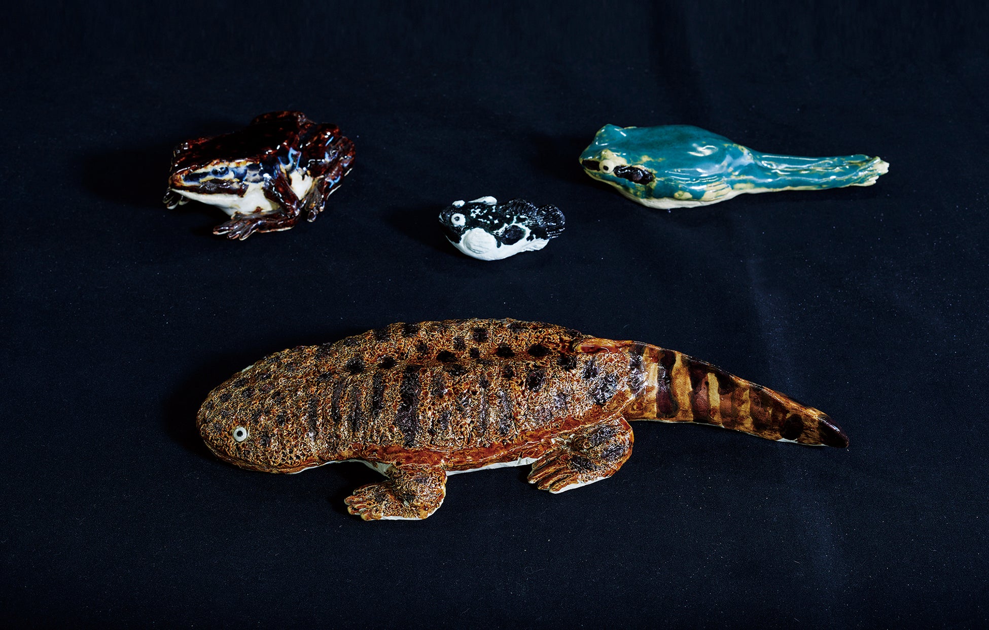 陶芸の分野の中の陶彫は土で自由自在に彫塑し、釉薬を施し、焼成する創作です。窯の中の変化が力を与えて、想いもかけない作品が創出する楽しみがあります。自然界の生物の造形の美と不思議を探求し、陶で表現し、追及しています。 特にワニ、蛙、亀、鮟鱇、フグ等をモチーフにした作品を制作しています。