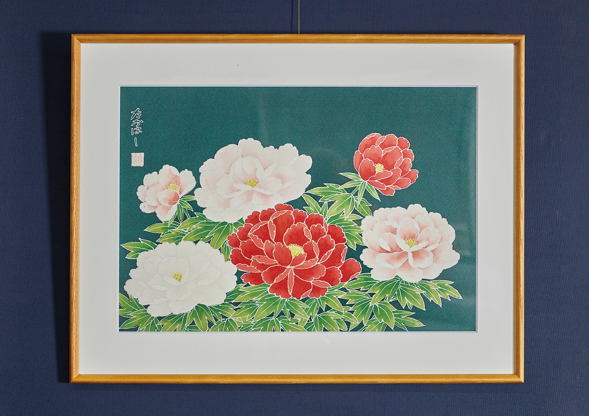振袖、留袖、訪問着、帯等、古典柄の糸目友禅を得意としている。最近は糊を駆使し、新しいイメージの作品作りを心掛け、ライフワークとしている。特に今、糊疋田の可能性を追求している。
