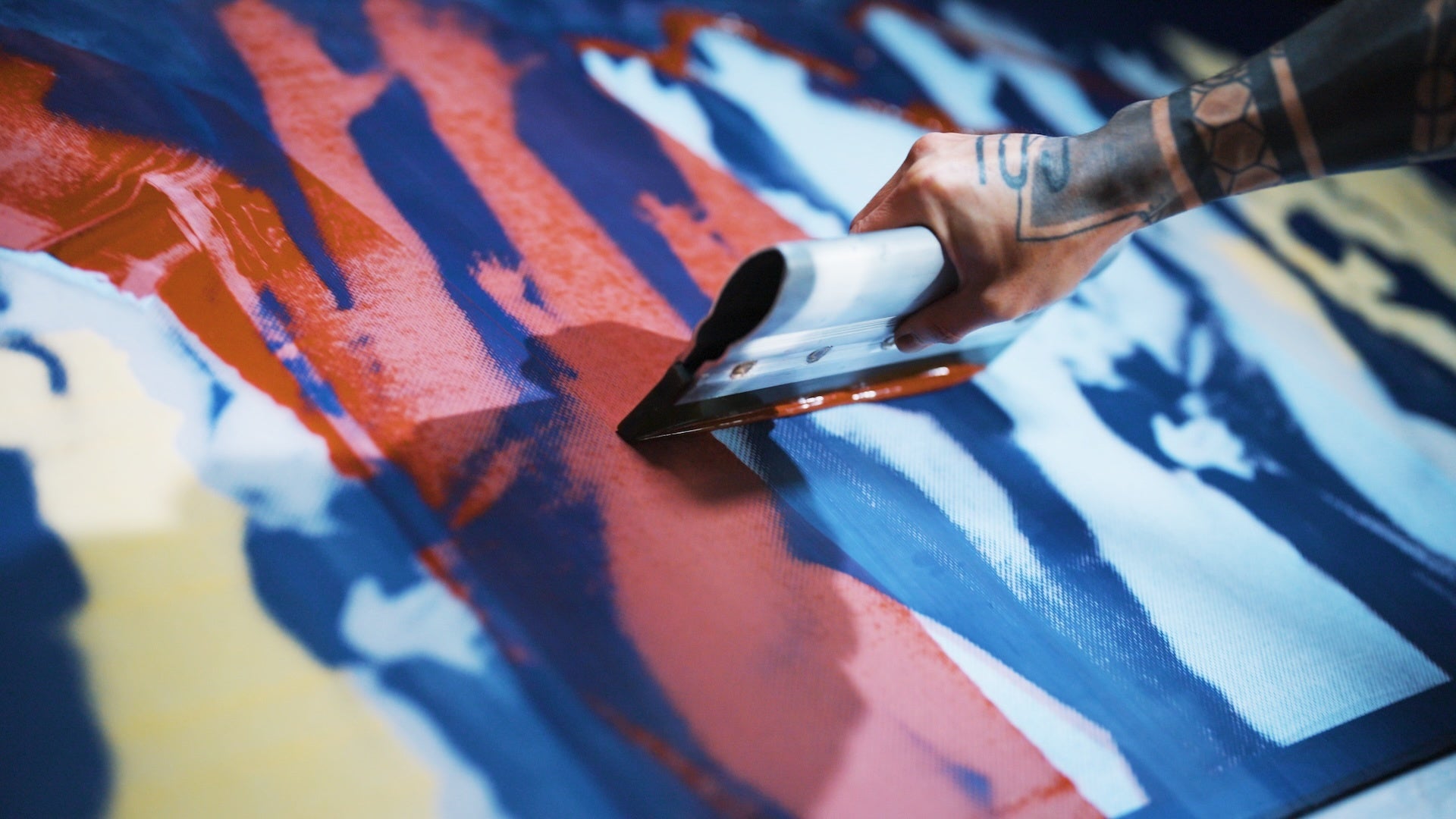 ストリートカルチャーをテーマに直感的にデザインしたオリジナルの手捺染。体温により色が変化する染料を調合し、職人が1枚1枚型で染め上げています。