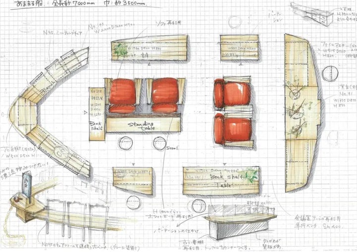 再生家具「あま丸船」や、 ジーパンや布を座面にしたパッチワークチェア、カウンター、「海洋漂着プラゴミ」を使ったタイルなどを制作し、 “すてないこと”を軸に、資源と人の関係性がめぐる空間を実現しました。